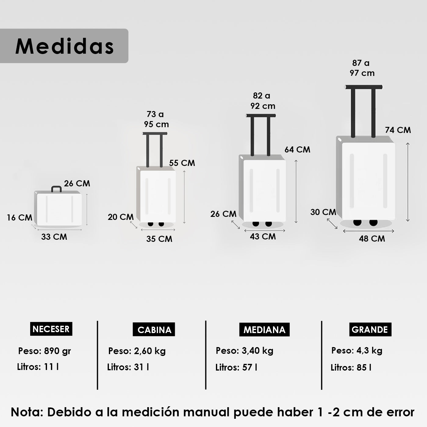 SET DE 4 MALETAS: Incluye un NECESER de 26x33x16cm con goma elástica para llevarlo sujeto con la maleta que desee, CABINA 55x35x20cm, MEDIANA 64x43x26cm y GRANDE 74x48x30cm.
