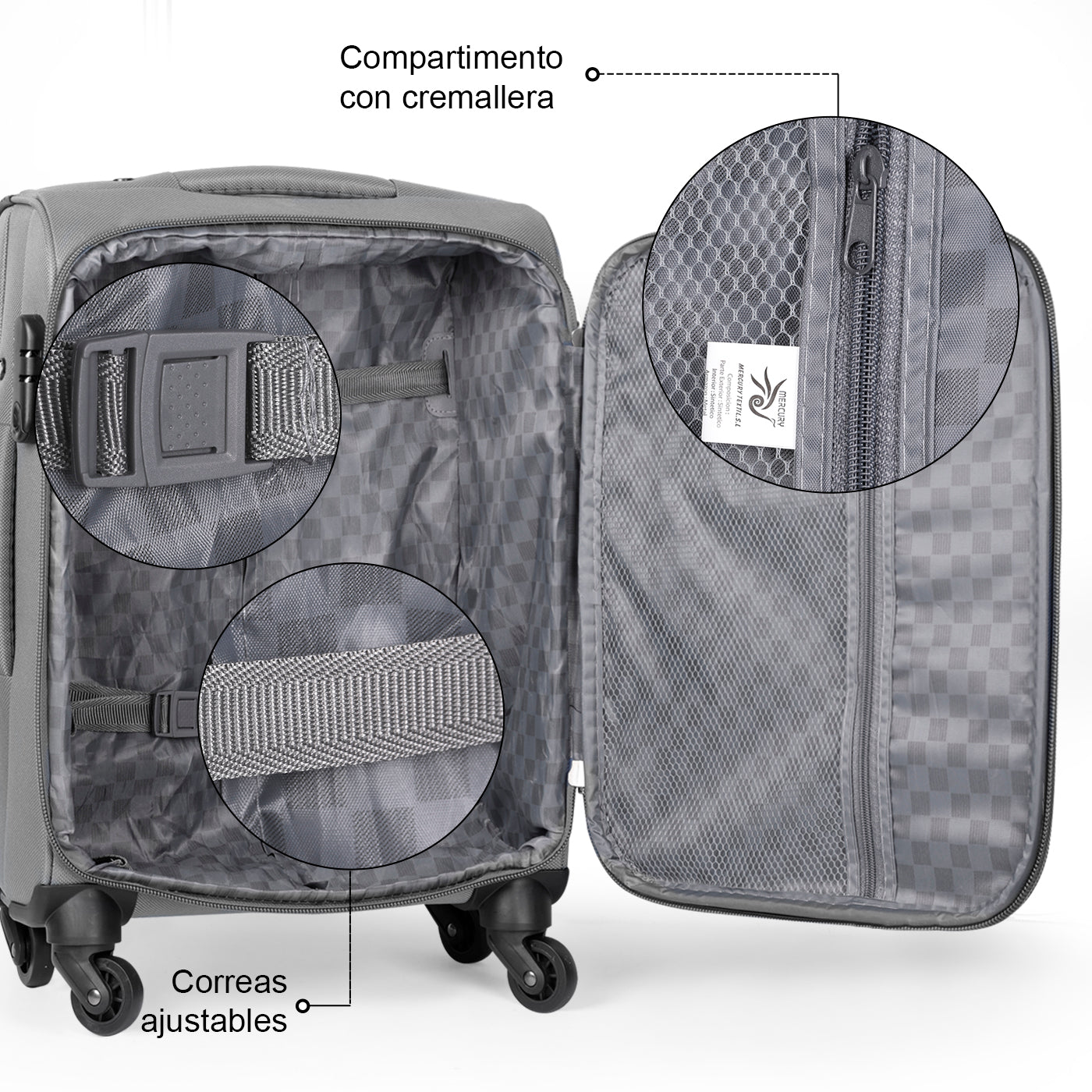 PACK: Incluye una maleta de cabina de 53x37x20cm, una maleta mediana de 65x40x25 y una maleta grande de 75x47x30cm. La maleta mediana y grande son ampliables gracias a una cremallera que lleva alrededor para disfrutar de un 15% más de espacio.