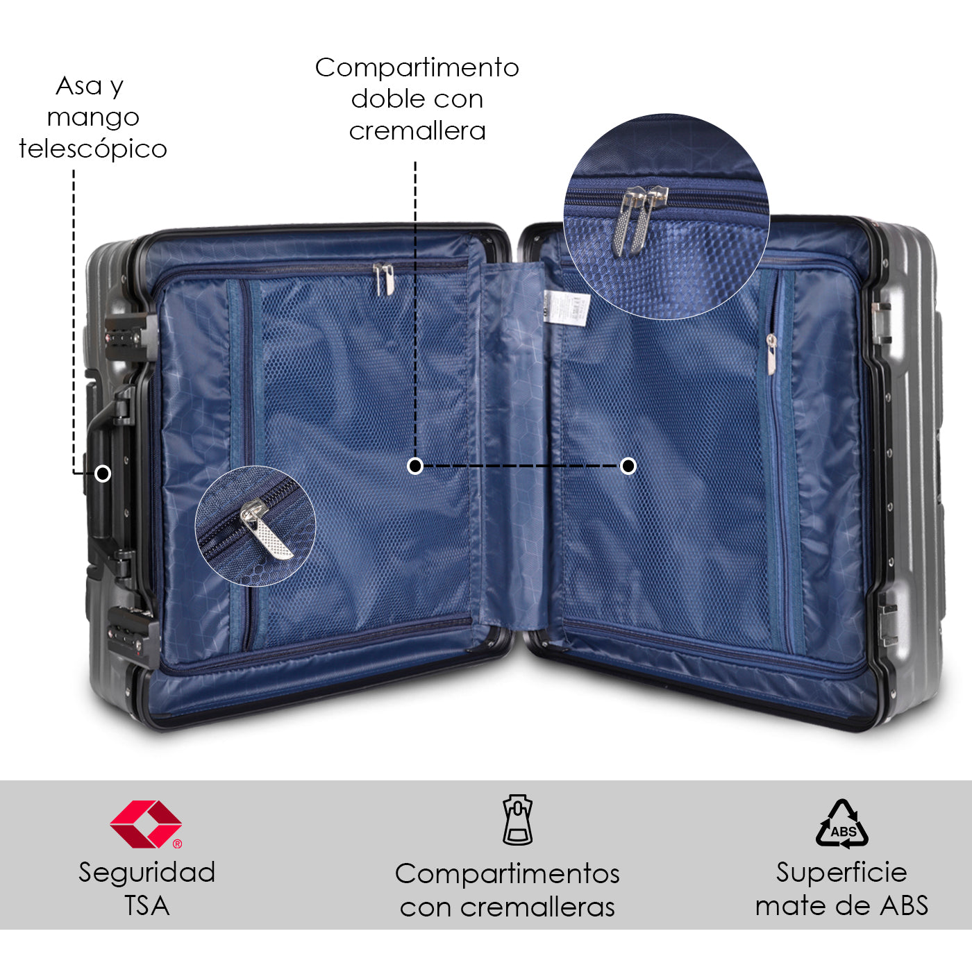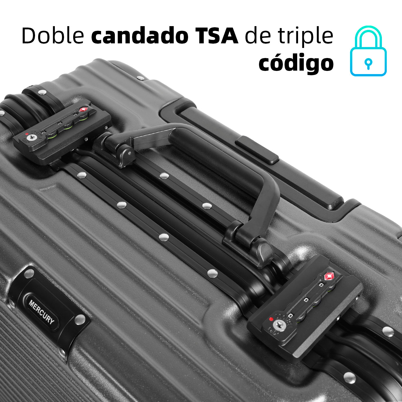 CIERRE TSA: Tiene un doble candado de combinación TSA de triple código. El personal del aeropuerto tiene una llave especial para abrir y cerrar la maleta sin que sea forzada.