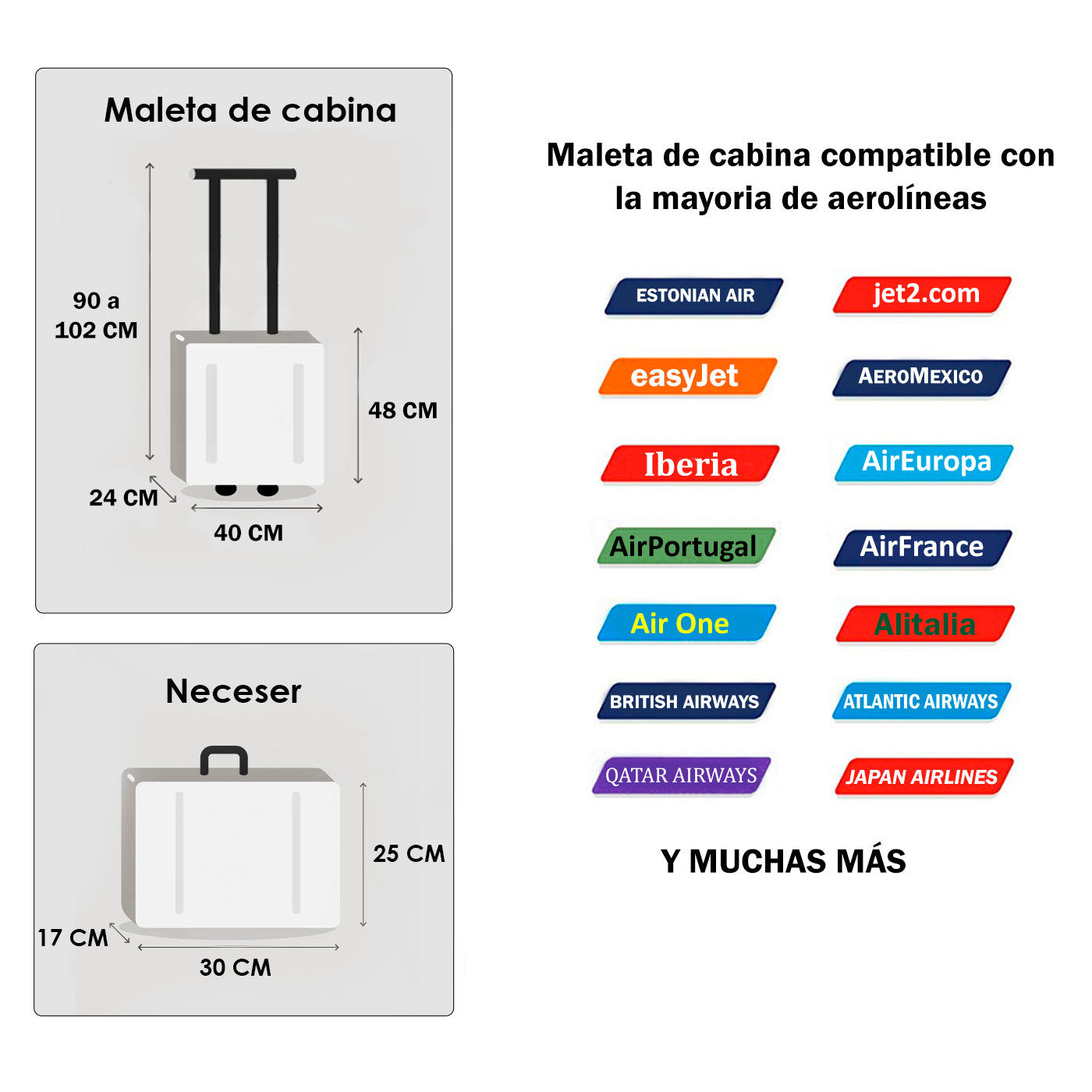 INCLUYE: Set de Maleta de cabina de Piloto 48x40x24cm dividido en dos partes con cremallera para proteger su contenido ambas con un bolsillo con cremallera. El neceser de 25x30x17cm dividido en dos partes, uno de ellos con cremallera y un bolsillo.