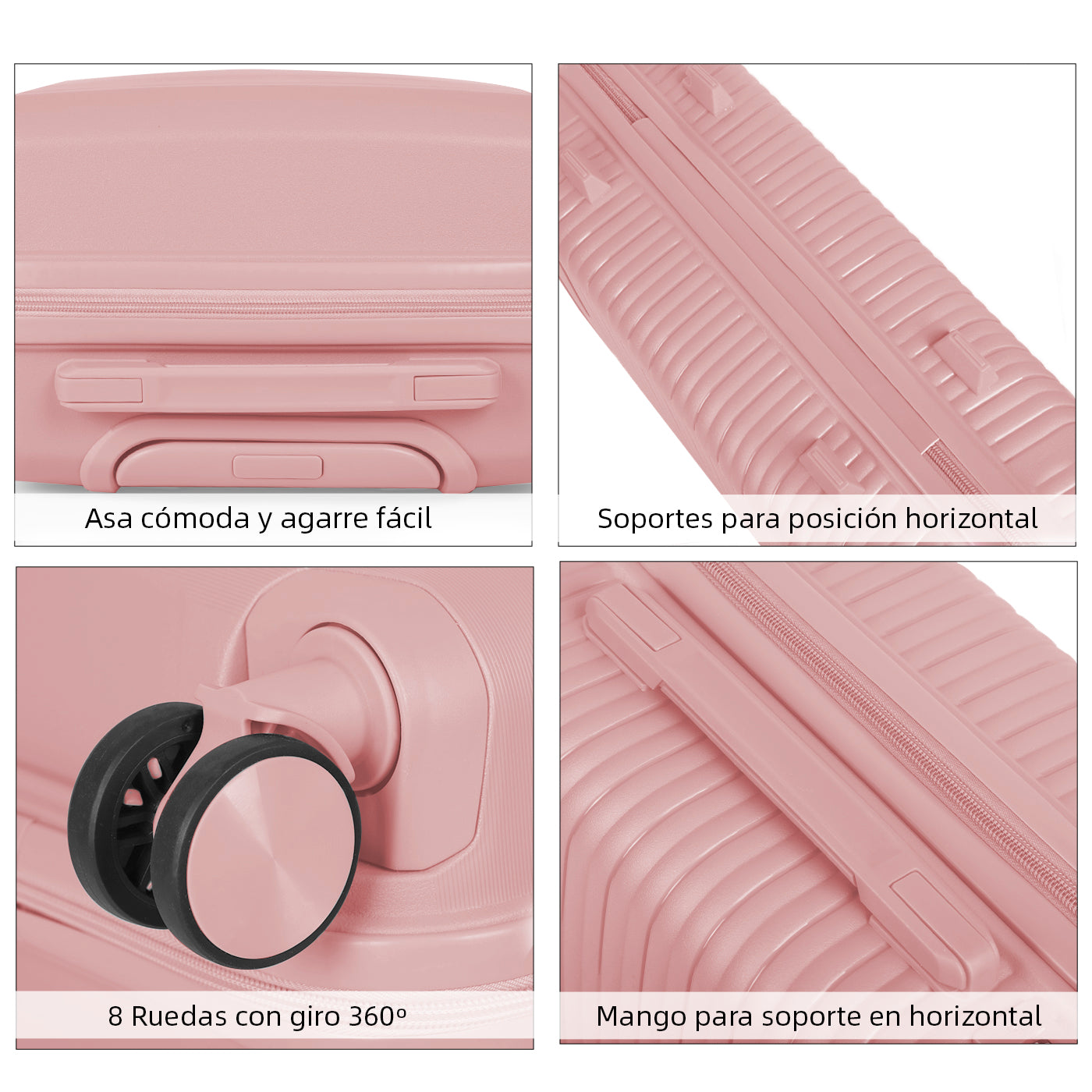 MANGO TELESCÓPICO Y ASA: Fácil manejo gracias a su mango telescópico ajustable y su asa superior para usar cualquiera de las maletas en espacios reducidos. El sistema de 4 ruedas dobles giratorias multidireccionales 360° garantiza un movimiento suave y silencioso.
