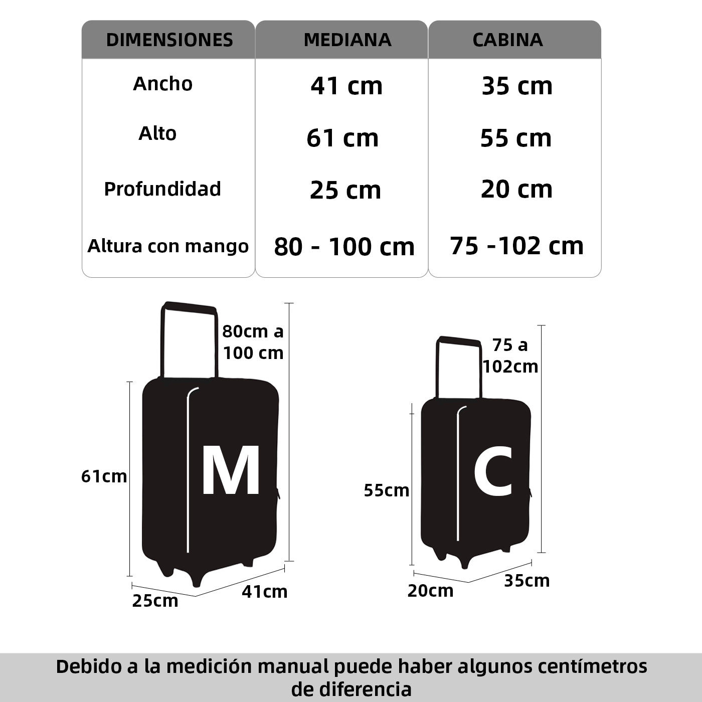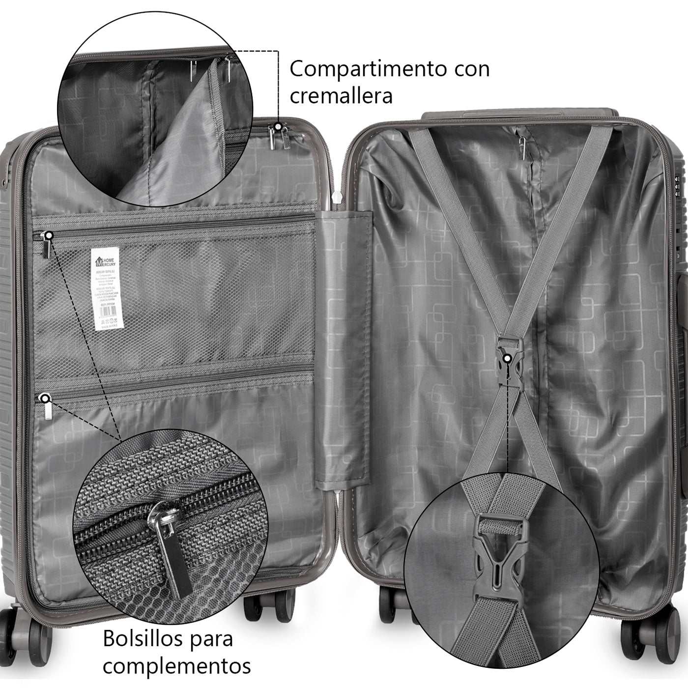 INCLUYE: Set de Maleta de cabina de 55x35x20cm y maleta mediana de 61x41x25cm. El interior de las dos maletas está dividido en dos partes, una con gomas elásticas para sujetar la ropa y la otra lleva una cremallera con bolsillos.